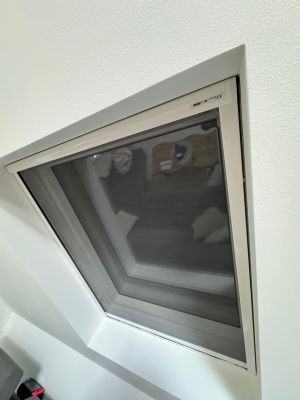 Es wird, für ein schnelles ein- und aushängen, mit gefederten Haltestifen und einer umlaufenden Bürstendichtung im Dachfensterausschnitt als kompletter Rahmen angebracht oder frontal an der Dachschräge angeschraubt.
